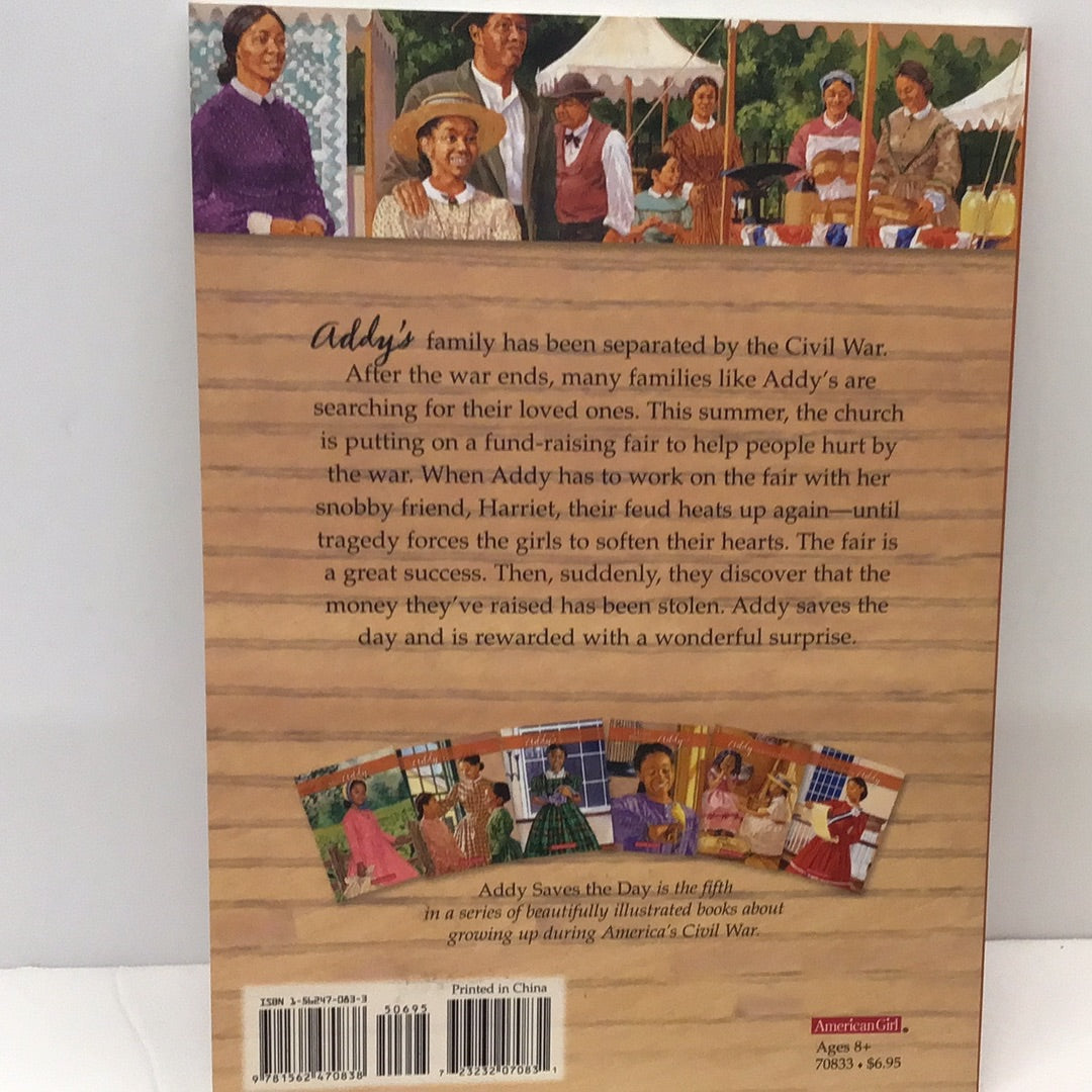 After the Civil War ends, many families like Addy's are searching for their loved ones. This summer, Addy's church is putting on a fund-raising fair to help people hurt by the war. When Addy has to work at the fair with snobby Harriet, their feud heats up again--until tragedy forces the girls to soften their hearts. The fair is a great success. Then, suddenly, the girls discover that the money they've raised has been stolen. Addy saves the day, which ends with a wonderful surprise.