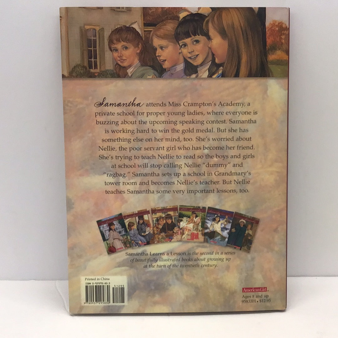 Samantha attends Miss Crampton's Academy, a private school for proper young ladies. Samantha wants to win the gold medal in the speaking contest, but she's worried about Nellie, the poor servant girl who has become her friend. If she can teach Nellie to read, maybe the boys and girls at school will stop calling Nellie "dummy" and "ragbag." Samantha sets up a school in Grandmary's tower room and becomes Nellie's teacher. But Nellie teaches Samantha some very important lessons, too.