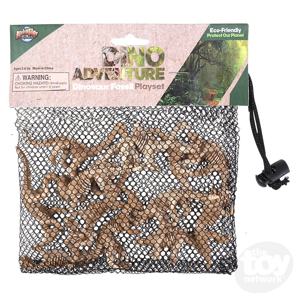 These mesh bag play sets are perfect impulse toys for kids, featuring durable plastic dinosaur fossil figures sold in reusable netted bags.