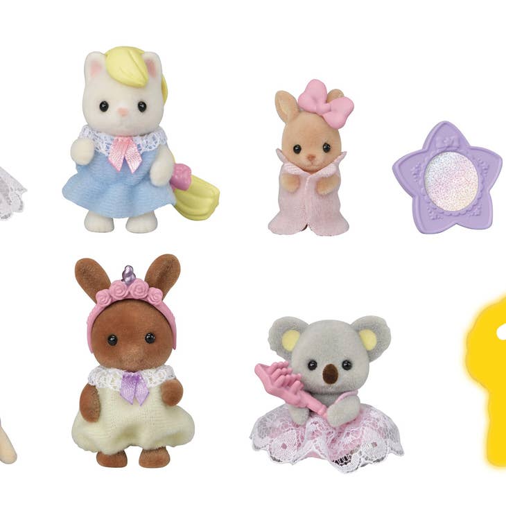 Collect Baby Fun Hair Series blind bag collectibles from Calico Critters! This ninth series of collectibles includes 8 styles of posed or poseable baby figures, each with fun hair accessory. There's even one secret style!