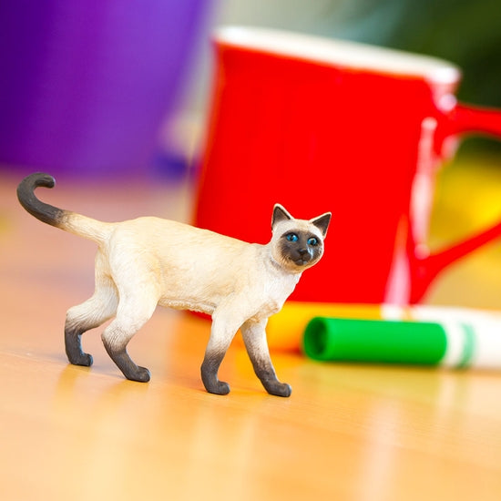 One of the oldest breeds of Asian cats, the Siamese originates from Thailand, which was once known as Siam. The most distinctive feature of this cat is its pointed coat, with a pale cream-colored body and darker brown at its points: the feet, face, ears, and tip of the tail. Scientific Name: Felis catus Characteristics: The inquisitive Siamese cat figure is slinking along with its slender body. Turning its head with its ears perked, it seems to have just noticed you there! Size and Color: This cat figure is 3 ¼ inches long and 2 inches high, making it almost exactly the size of a credit card stood on its side. It features the typical Siamese pointed pattern, with a pale cream body and dark brown at the feet, face, ears, and tail tip. It also has striking blue eyes, another trademark Siamese feature. The Siamese Cat is part of the Best in Show collection All of our products are Non-toxic and BPA-free.
